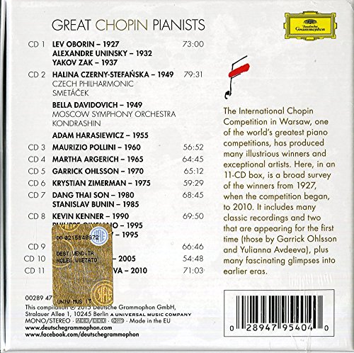 The International Chopin Competition in Warsaw, one of the world s greatest piano competitions, has produced many illustrious winners and exceptional artists. Here, in an 11-CD box, is a broad survey of the winners from 1927, when the competition began, to 2010.Capbox with striking image based on the Chopin Institute logo.Charismatic sleeves with photos of the artists.New liner notes by Grzegorz Michalski of the Chopin Institute in English, German, French and Polish, plus a note on the history of the Chopin Institute.CD 1LEV OBORIN/1927: Piano Sonata No.3 in B minor Op.58, Berceuse in D flat major Op.57, Nocturne in C sharp minor Op.posthALEXANDRE UNINSKY/1932: Mazurka Op.6 No.1, Mazurka Op.63 No.3, Waltz in G flat major Op. posth. 70 No.1, Barcarolle in F sharp major Op.60, Etude in C Sharp minor, Op.25 No.7 YAKOV ZAK/1937 Grande Valse Brillante in F Op.34 No.3; Nocturne in B major Op.32 No.1; Nocturne in G minor Op.37 No.1, Mazurka in E minor Op.17 No.2, Mazurka in G sharp minor Op.33 No.1, Mazurka in F minor Op.63 No.2, Mazurka in C sharp minor Op.63 No.3 CD 2HALINA CZERNY-STEFANSKA/1949: Piano Concerto No.1 in E minor Op.11BELLA DAVIDOVICH / 1949: Piano Concerto No.2 in F minor Op.21ADAM HARASIEWICZ/1955: Ballade No.1 in G minor Op.23, Etude in G sharp minor Op.25 No.6 CD 3MAURIZIO POLLINI/1960: 12 Etudes Op.25, Piano Sonata No.2 in B flat minor Op.35, Berceuse in D flat major Op.57CD 4MARTHA ARGERICH/1965: 24 Preludes Op.28, Prelude in C sharp minor Op.45, Prelude in A flat major op post., Scherzo No.3 in C sharp minor Op.39, 3 Mazurkas Op.59, Polonaise-Fantaisie in A flat major Op.61 CD 5 FIRST RELEASEGARRICK OHLSSON/1970: Mazurka in C sharp minor, Op.50 No.3, Mazurka in A minor, Op.7 No.2, Nocturne in D flat major, Op.27 No.2, Nocturne in C sharp minor, Op.27 No.1, Scherzo in C sharp minor, Op.39, Waltz in C sharp minor,Op.64 No.2, Ballade No.3 in A flat Op.47, Waltz in E flat major Op.18, Fantasy in F minor Op.49, Waltz in A flat major Op.42, Etude in C sharp minor Op.10 No.4 CD 6KRYSTIAN ZIMERMAN/1975: 4 Ballades; Barcarolle in F sharp major Op.60, Fantaisie in F minor Op.49 CD 7DANG THAI-SON/1980: Nocturne in F sharp major Op.15 No.2, Nocturne in C sharp minor Op.27 No.1, Waltz in A minor Op.34 No.2, Andante spianato and Grand Polonaise in E flat major Op.22, Mazurka in C major Op.24 No.2, Mazurka in G minor Op.67 No.2, Scherzo in B flat minor Op.31STANISLAV BUNIN/1985: Ballade No.4 in F minor Op.52, 4 Mazurkas Op.33, Waltz in F major Op.34 No.3, Polonaise in A flat major Op.53 CD 8KEVIN KENNER/1990: Impromptu in F sharp major Op.36, Etude in C sharp minor Op.10 No.4, Ballade No.4 in F minor Op.52, Etude in C minor Op.10 No.12, Scherzo No.2 in C sharp minor Op.39PHILIPPE GIUSIANO/1995:Nocturne in A flat Op.32 No.2, Waltz in C sharp minor Op.64 No.2, Ballade No.2 in F major Op.38, Waltz in E flat major Op.18ALEXEI SULTANOV/1995: Etude in E minor Op.25 No.5, Etude in G sharp minor Op.25 No.6, Etude in C minor Op.10 No.12, Nocturne in C minor Op.48 No.1, Polonaise in A flat major Op.53 CD 9YUNDI LI/2000: Sonata No.3 in B minor Op.58, Andante spianato and Grand Polonaise in E flat Op.22, Etude in A minor Op.10 No.2, Etude in G flat major Op.10 No.5, Etude in A minor Op.25 No.11 Winter Wind, Nocturne in B flat minor Op.9 No.1, 2 Nocturnes Op.9, Nocturne in F sharp major Op.15 No.2, Impromptu in C sharp minor Op.66 Fantasy ImpromptuCD 10RAFAL BLECHACZ/2005: Polonaises Nos.1 6, Polonaise-Fantaisie in A flat major Op.61CD 11YULIANNA AVDEE/2010: Waltz in A flat major Op.34 No.1, Nocturne in B major Op.62 No.1, Scherzo No.1 in B minor Op.20, Four Mazurkas Op.33, Scherzo No.4 in E major Op.54, 3 Mazurkas Op.30, Prelude in C sharp minor Op.45, Mazurka in C sharp minor Op.30 No.4, Polonaise-Fantaisie in A flat major Op.61