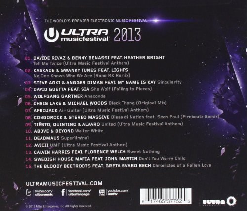 2013 release, the official compilation from Ultra Music Records, and a must for fans of electronic dance music. This 15-track compilation includes all four of the Ultra Music Festival anthems from Avicii, Ti‰sto and Quintino & Alvaro, Benny Benassi and Davide Rivaz and Afrojack.